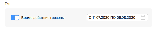| **Время действия геозоны** | <p>Если геозона должна действовать только в определенный календарный период, нажмите слайдер "Время действия геозоны".</p><p><img src="https://3741676519-files.gitbook.io/~/files/v0/b/gitbook-legacy-files/o/assets%2F-MDkslDt_AzOr99YPhgd%2F-MEEj5DGKjVkqUID7DGd%2F-MEEpGHBaphsbta4976R%2F%D0%A1%D0%BD%D0%B8%D0%BC%D0%BE%D0%BA%20%D1%8D%D0%BA%D1%80%D0%B0%D0%BD%D0%B0%202020-08-09%20%D0%B2%2000.32.19.png?alt=media&#x26;token=3903a437-0b2a-45f6-8dcd-1422e07fbc3c" alt="" data-size="original"></p><p>Выберите период, в выпадающем календаре. При задании даты срок действий указывается до даты невключительно: например, срок действия геозоны до 01.03.2021 будет означать, что геозона будет работать до 00:00 01.03.2021 по времени UTC. <img src="https://3741676519-files.gitbook.io/~/files/v0/b/gitbook-legacy-files/o/assets%2F-MDkslDt_AzOr99YPhgd%2F-MEEj5DGKjVkqUID7DGd%2F-MEEpi-EkSwDp9uJ4jip%2F%D0%A1%D0%BD%D0%B8%D0%BC%D0%BE%D0%BA%20%D1%8D%D0%BA%D1%80%D0%B0%D0%BD%D0%B0%202020-08-09%20%D0%B2%2000.32.53.png?alt=media&#x26;token=7dd43718-eef7-487a-b7b3-d616a4aa3cef" alt="" data-size="original"> </p> |